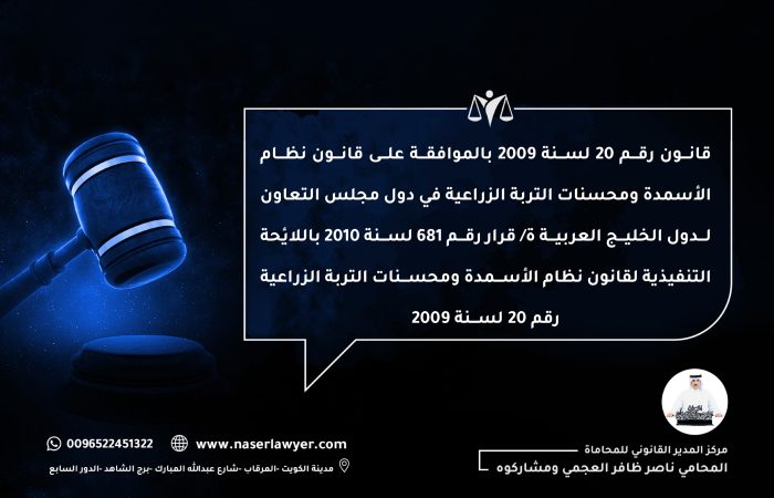 قانون رقم 20 لسنة 2009 بالموافقة على قانون نظام الأسمدة ومحسنات التربة الزراعية في دول مجلس التعاون لدول الخليج العربية ة/ قرار رقم 681 لسنة 2010 باللائحة التنفيذية لقانون نظام الأسمدة ومحسنات التربة الزراعية رقم 20 لسنة 2009