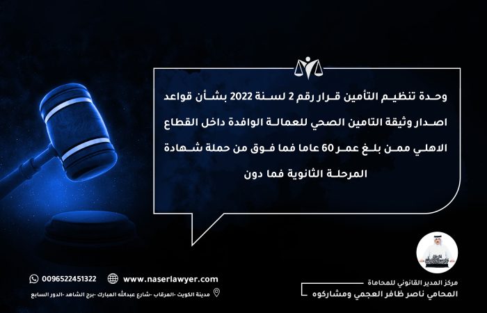 وحدة تنظيم التأمين قرار رقم 2 لسنة 2022 بشأن قواعد اصدار وثيقة التامين الصحي للعمالة الوافدة داخل القطاع الاهلي ممن بلغ عمر 60 عاما فما فوق من حملة شهادة المرحلة الثانوية فما دون