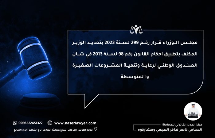 مجلس الوزراء قرار رقم 299 لسنة 2023 بتحديد الوزير المكلف بتطبيق احكام القانون رقم 98 لسنة 2013 في شان الصندوق الوطني لرعاية وتنمية المشروعات الصغيرة والمتوسطة